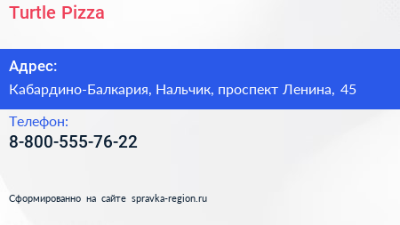 Turtle Pizza по адресу Кабардино-Балкария, Нальчик, проспект Ленина, 45 в дальнейшем Организация, размещена в следующих категориях: