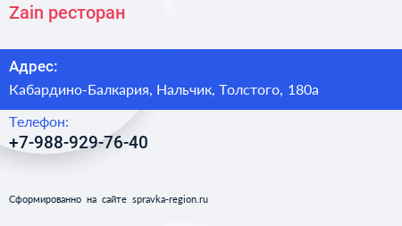 Zain, ресторан по адресу Кабардино-Балкария, Нальчик, Толстого, 180а в дальнейшем Организация, размещена в следующих категориях: