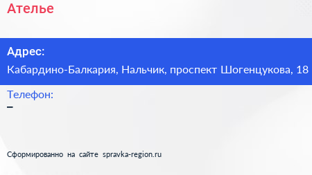 Ателье по адресу Кабардино-Балкария, Нальчик, проспект Шогенцукова, 18 в дальнейшем Организация, размещена в следующих категориях: