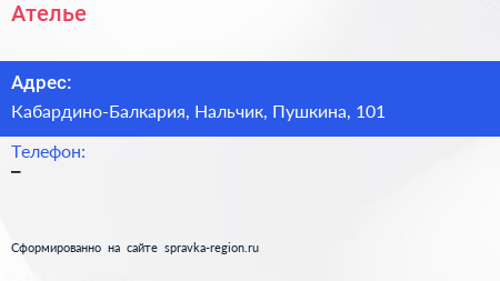 Ателье по адресу Кабардино-Балкария, Нальчик, Пушкина, 101 в дальнейшем Организация, размещена в следующих категориях: