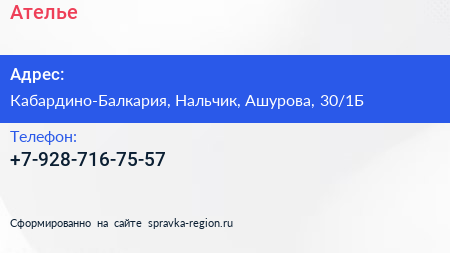 Ателье по адресу Кабардино-Балкария, Нальчик, Ашурова, 30/1Б в дальнейшем Организация, размещена в следующих категориях: