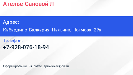 Ателье Сановой Л. по адресу Кабардино-Балкария, Нальчик, Ногмова, 29а в дальнейшем Организация, размещена в следующих категориях: