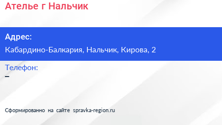 Ателье, г. Нальчик по адресу Кабардино-Балкария, Нальчик, Кирова, 2 в дальнейшем Организация, размещена в следующих категориях: