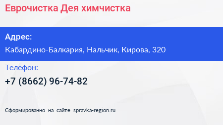 Еврочистка Дея, химчистка по адресу Кабардино-Балкария, Нальчик, Кирова, 320 в дальнейшем Организация, размещена в следующих категориях: