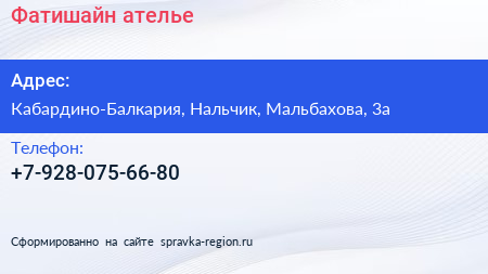 Фатишайн, ателье по адресу Кабардино-Балкария, Нальчик, Мальбахова, 3а в дальнейшем Организация, размещена в следующих категориях: