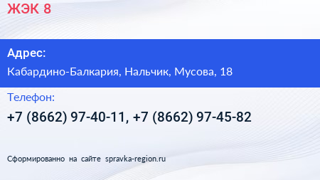 ЖЭК №8 по адресу Кабардино-Балкария, Нальчик, Мусова, 18 в дальнейшем Организация, размещена в следующих категориях: