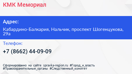 КМК Мемориал по адресу Кабардино-Балкария, Нальчик, проспект Шогенцукова, 29а в дальнейшем Организация, размещена в следующих категориях: