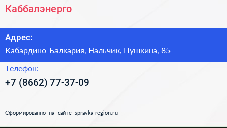 Каббалэнерго по адресу Кабардино-Балкария, Нальчик, Пушкина, 85 в дальнейшем Организация, размещена в следующих категориях: