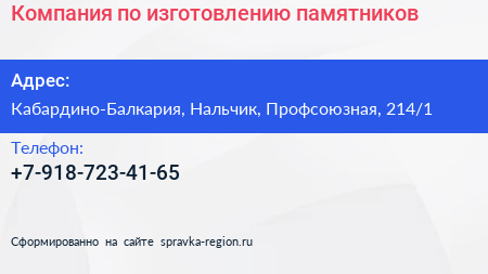 Компания по изготовлению памятников по адресу Кабардино-Балкария, Нальчик, Профсоюзная, 214/1 в дальнейшем Организация, размещена в следующих категориях: