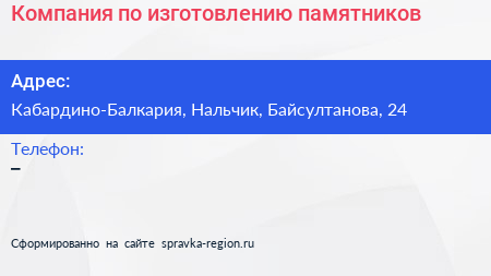 Компания по изготовлению памятников по адресу Кабардино-Балкария, Нальчик, Байсултанова, 24 в дальнейшем Организация, размещена в следующих категориях: