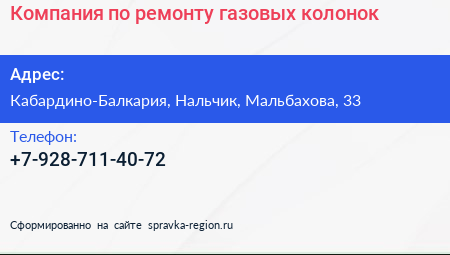 Компания по ремонту газовых колонок по адресу Кабардино-Балкария, Нальчик, Мальбахова, 33 в дальнейшем Организация, размещена в следующих категориях: