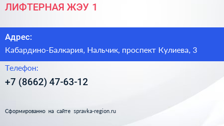 ЛИФТЕРНАЯ ЖЭУ №1 по адресу Кабардино-Балкария, Нальчик, проспект Кулиева, 3 в дальнейшем Организация, размещена в следующих категориях: