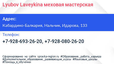 Lyubov Laveykina, меховая мастерская по адресу Кабардино-Балкария, Нальчик, Идарова, 133 в дальнейшем Организация, размещена в следующих категориях:
