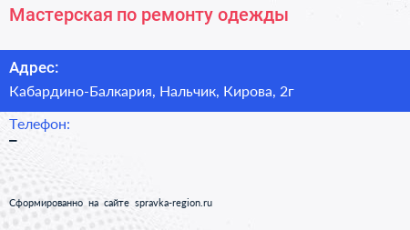 Мастерская по ремонту одежды по адресу Кабардино-Балкария, Нальчик, Кирова, 2г в дальнейшем Организация, размещена в следующих категориях: