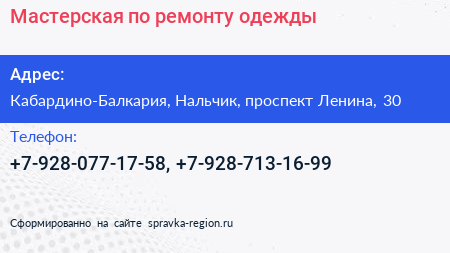 Мастерская по ремонту одежды по адресу Кабардино-Балкария, Нальчик, проспект Ленина, 30 в дальнейшем Организация, размещена в следующих категориях: