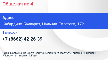 Общежитие №4 по адресу Кабардино-Балкария, Нальчик, Толстого, 179 в дальнейшем Организация, размещена в следующих категориях: