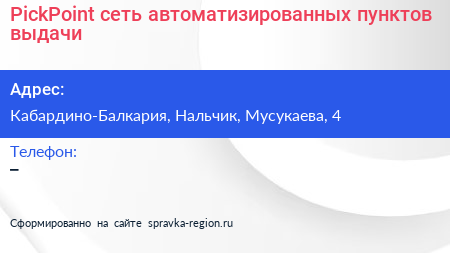 PickPoint, сеть автоматизированных пунктов выдачи по адресу Кабардино-Балкария, Нальчик, Мусукаева, 4 в дальнейшем Организация, размещена в следующих категориях: