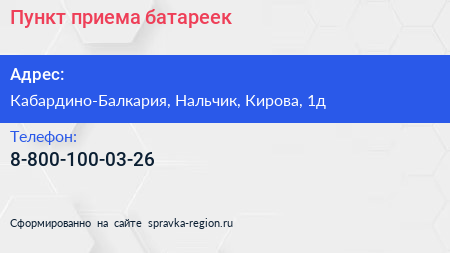Пункт приема батареек по адресу Кабардино-Балкария, Нальчик, Кирова, 1д в дальнейшем Организация, размещена в следующих категориях: