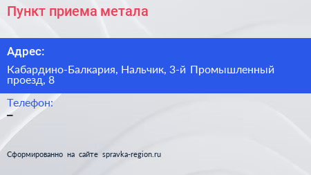 Пункт приема метала по адресу Кабардино-Балкария, Нальчик, 3-й Промышленный проезд, 8 в дальнейшем Организация, размещена в следующих категориях: