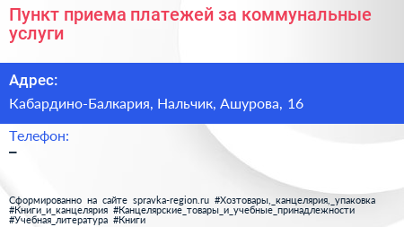 Пункт приема платежей за коммунальные услуги по адресу Кабардино-Балкария, Нальчик, Ашурова, 16 в дальнейшем Организация, размещена в следующих категориях: