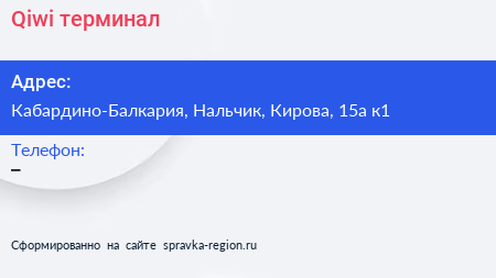 Qiwi, терминал по адресу Кабардино-Балкария, Нальчик, Кирова, 15а к1 в дальнейшем Организация, размещена в следующих категориях: