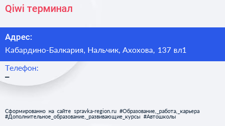 Qiwi, терминал по адресу Кабардино-Балкария, Нальчик, Ахохова, 137 вл1 в дальнейшем Организация, размещена в следующих категориях: