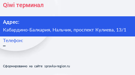 Qiwi, терминал по адресу Кабардино-Балкария, Нальчик, проспект Кулиева, 13/1 в дальнейшем Организация, размещена в следующих категориях: