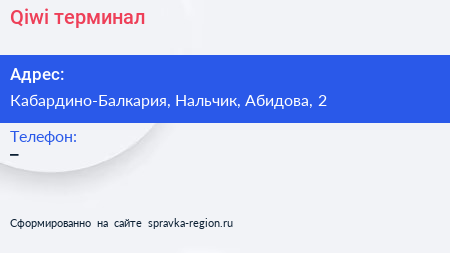 Qiwi, терминал по адресу Кабардино-Балкария, Нальчик, Абидова, 2 в дальнейшем Организация, размещена в следующих категориях: