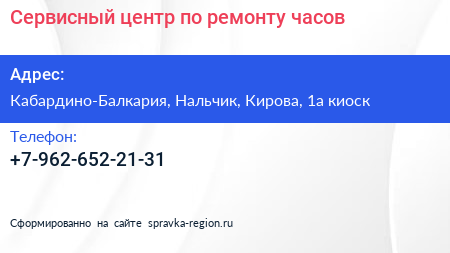 Сервисный центр по ремонту часов по адресу Кабардино-Балкария, Нальчик, Кирова, 1а киоск в дальнейшем Организация, размещена в следующих категориях: