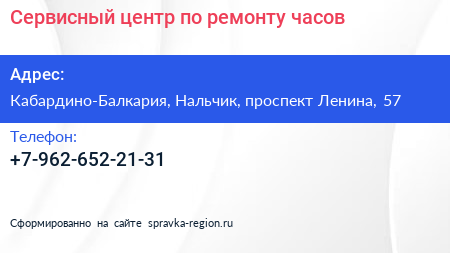 Сервисный центр по ремонту часов по адресу Кабардино-Балкария, Нальчик, проспект Ленина, 57 в дальнейшем Организация, размещена в следующих категориях: