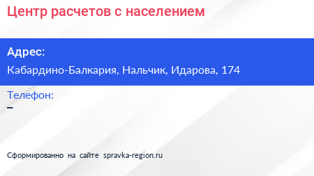 Центр расчетов с населением по адресу Кабардино-Балкария, Нальчик, Идарова, 174 в дальнейшем Организация, размещена в следующих категориях:
