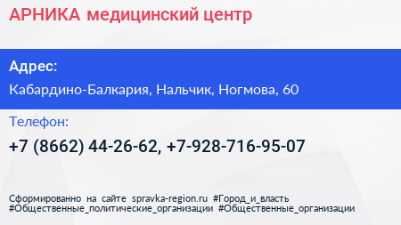 АРНИКА, медицинский центр по адресу Кабардино-Балкария, Нальчик, Ногмова, 60 в дальнейшем Организация, размещена в следующих категориях: