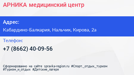АРНИКА, медицинский центр по адресу Кабардино-Балкария, Нальчик, Кирова, 2а в дальнейшем Организация, размещена в следующих категориях: