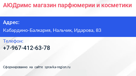 АЮДримс, магазин парфюмерии и косметики по адресу Кабардино-Балкария, Нальчик, Идарова, 83 в дальнейшем Организация, размещена в следующих категориях:
