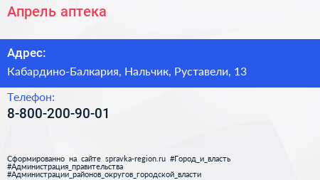 Апрель, аптека по адресу Кабардино-Балкария, Нальчик, Руставели, 13 в дальнейшем Организация, размещена в следующих категориях:
