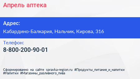 Апрель, аптека по адресу Кабардино-Балкария, Нальчик, Кирова, 316 в дальнейшем Организация, размещена в следующих категориях: