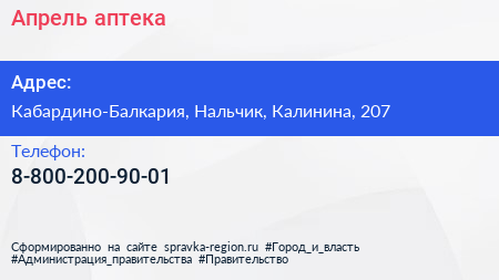 Апрель, аптека по адресу Кабардино-Балкария, Нальчик, Калинина, 207 в дальнейшем Организация, размещена в следующих категориях: