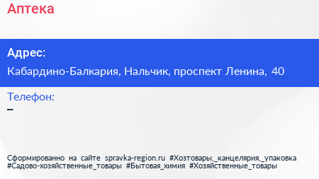 Аптека по адресу Кабардино-Балкария, Нальчик, проспект Ленина, 40 в дальнейшем Организация, размещена в следующих категориях: