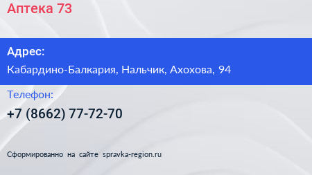 Аптека №73 по адресу Кабардино-Балкария, Нальчик, Ахохова, 94 в дальнейшем Организация, размещена в следующих категориях: