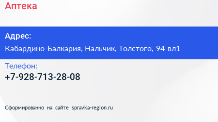 Аптека по адресу Кабардино-Балкария, Нальчик, Толстого, 94 вл1 в дальнейшем Организация, размещена в следующих категориях: