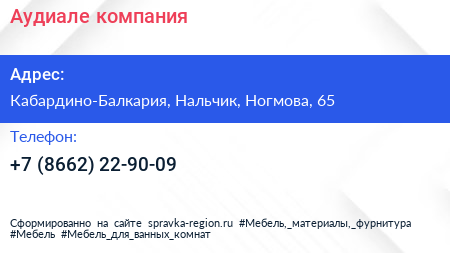 Аудиале, компания по адресу Кабардино-Балкария, Нальчик, Ногмова, 65 в дальнейшем Организация, размещена в следующих категориях: