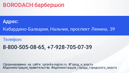 BORODACH, барбершоп по адресу Кабардино-Балкария, Нальчик, проспект Ленина, 39 в дальнейшем Организация, размещена в следующих категориях: