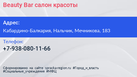 Beauty Bar, салон красоты по адресу Кабардино-Балкария, Нальчик, Мечникова, 183 в дальнейшем Организация, размещена в следующих категориях: