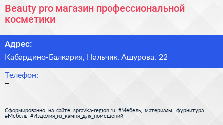 Beauty pro, магазин профессиональной косметики по адресу Кабардино-Балкария, Нальчик, Ашурова, 22 в дальнейшем Организация, размещена в следующих категориях: