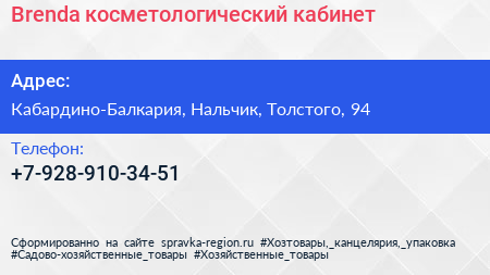 Brenda, косметологический кабинет по адресу Кабардино-Балкария, Нальчик, Толстого, 94 в дальнейшем Организация, размещена в следующих категориях: