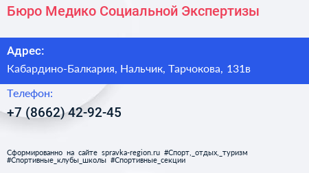 Бюро Медико-Социальной Экспертизы по адресу Кабардино-Балкария, Нальчик, Тарчокова, 131в в дальнейшем Организация, размещена в следующих категориях: