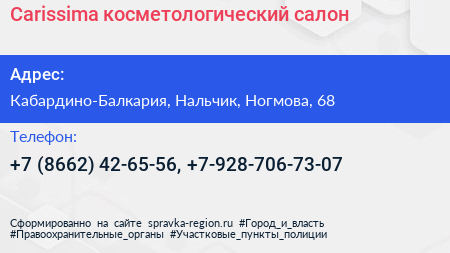Carissima, косметологический салон по адресу Кабардино-Балкария, Нальчик, Ногмова, 68 в дальнейшем Организация, размещена в следующих категориях: