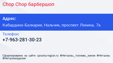 Chop-Chop, барбершоп по адресу Кабардино-Балкария, Нальчик, проспект Ленина, 7а в дальнейшем Организация, размещена в следующих категориях: