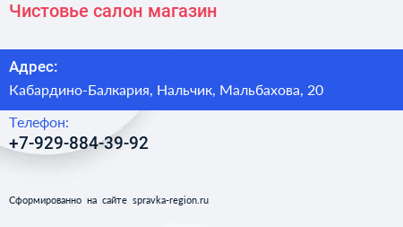 Чистовье, салон-магазин по адресу Кабардино-Балкария, Нальчик, Мальбахова, 20 в дальнейшем Организация, размещена в следующих категориях: