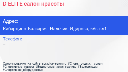 D`ELITE, салон красоты по адресу Кабардино-Балкария, Нальчик, Идарова, 56в вл1 в дальнейшем Организация, размещена в следующих категориях: